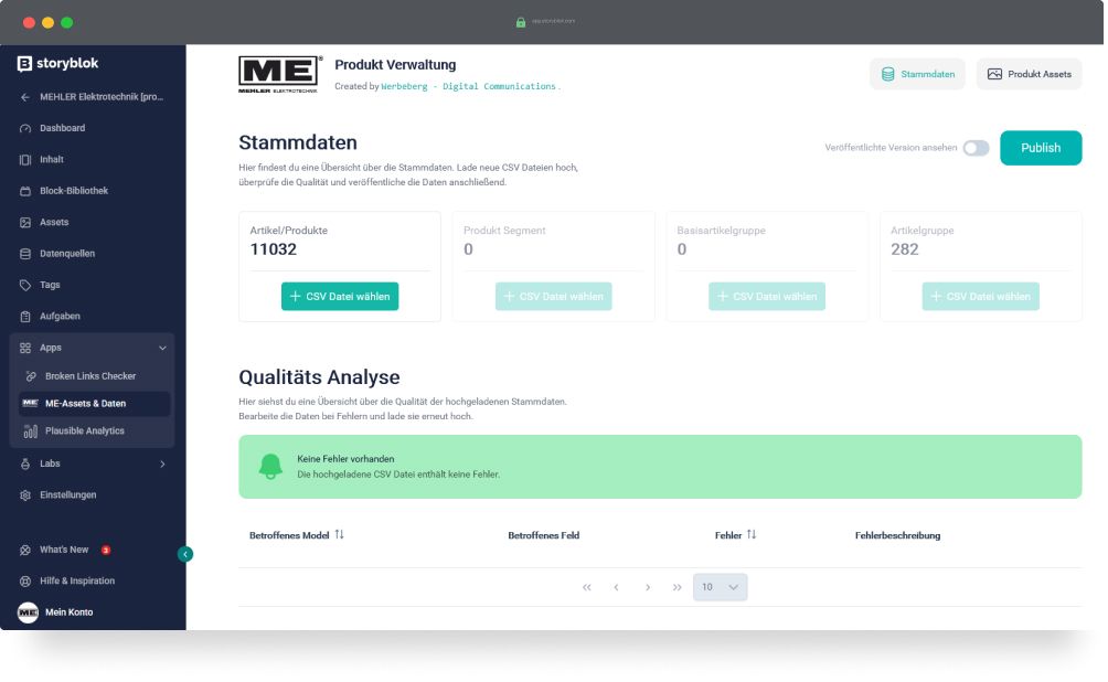 Product data is regularly exported from the ERP system and uploaded as a CSV file via a specially developed Storyblok app. dcupl takes over parsing, structuring, and validating the data. This creates a fully automated data flow from the ERP system to the website – without manual post-processing.